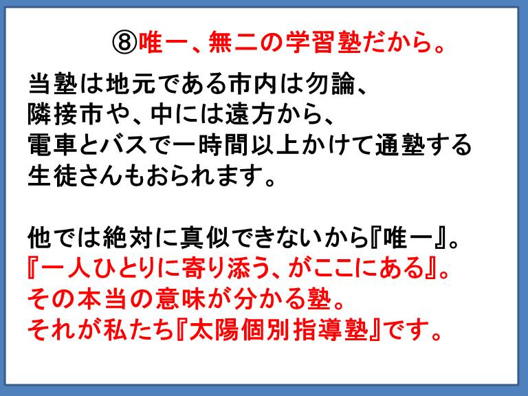 当塾は、私が『我が子』を預ける学習塾を探し回ったうえで、納得のいく塾が無かったために『自らの手で開塾』した、エゴとこだわりと、情熱のつまった学習塾です。